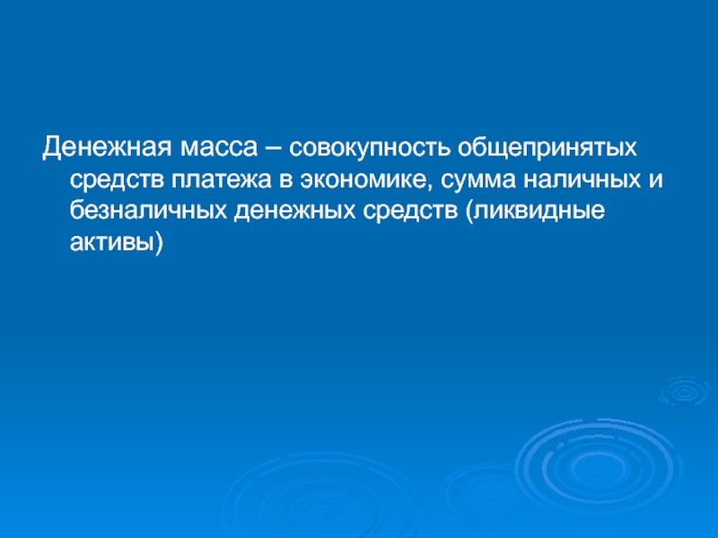Слайд 7Денежная масса – совокупность общепринятых средств платежа в экономике, сумма