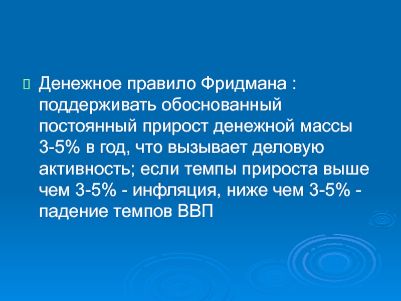 Слайд 17Денежное правило Фридмана : поддерживать обоснованный постоянный прирост денежной массы