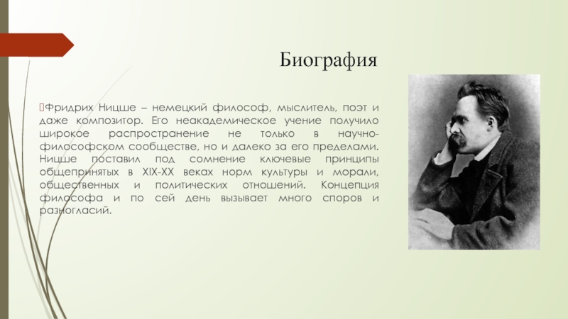 научно-философском сообществе, но и далеко за его пределами. Ницше поставил под сомнение ключевые принципы общепринятых в XIX-XX веках норм культуры и морали, общественных и политических отношений. Концепция философа и по сей день вызывает много споров и разногласий.