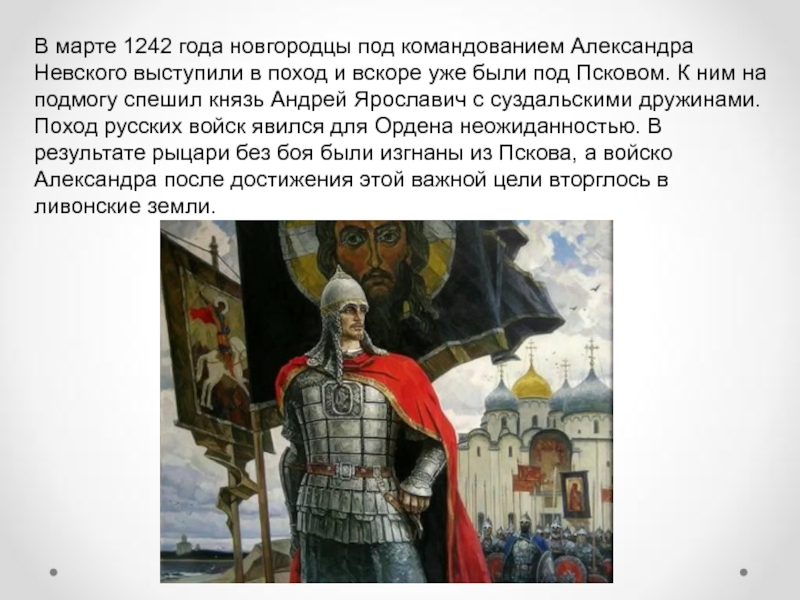Слайд 16В марте 1242 года новгородцы под командованием Александра Невского выступили