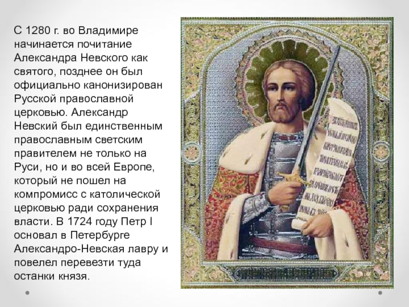 С 1280 г. во Владимире начинается почитание Александра Невского как святого, позднее он был официально канонизирован Русской