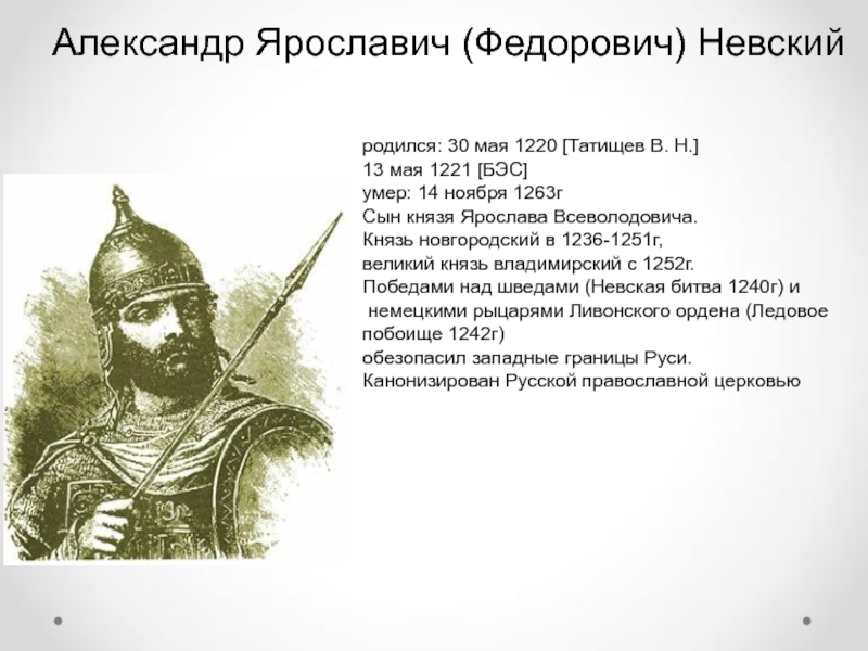 Александр Ярославич (Федорович) Невскийродился: 30 мая 1220 [Татищев В. Н.]13 мая 1221 [БЭС]умер: 14 ноября 1263гСын князя