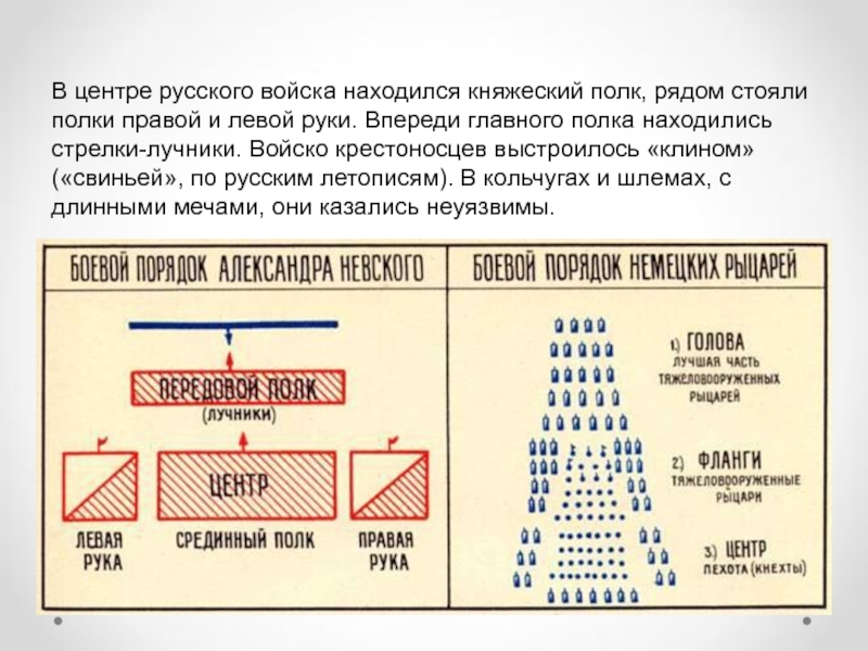 крестоносцев выстроилось «клином» («свиньей», по русским летописям). В кольчугах и шлемах, с длинными мечами, они казались неуязвимы.