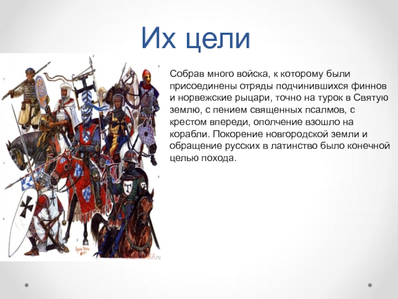 Их целиСобрав много войска, к которому были присоединены отряды подчинившихся финнов и норвежские рыцари, точно на турок