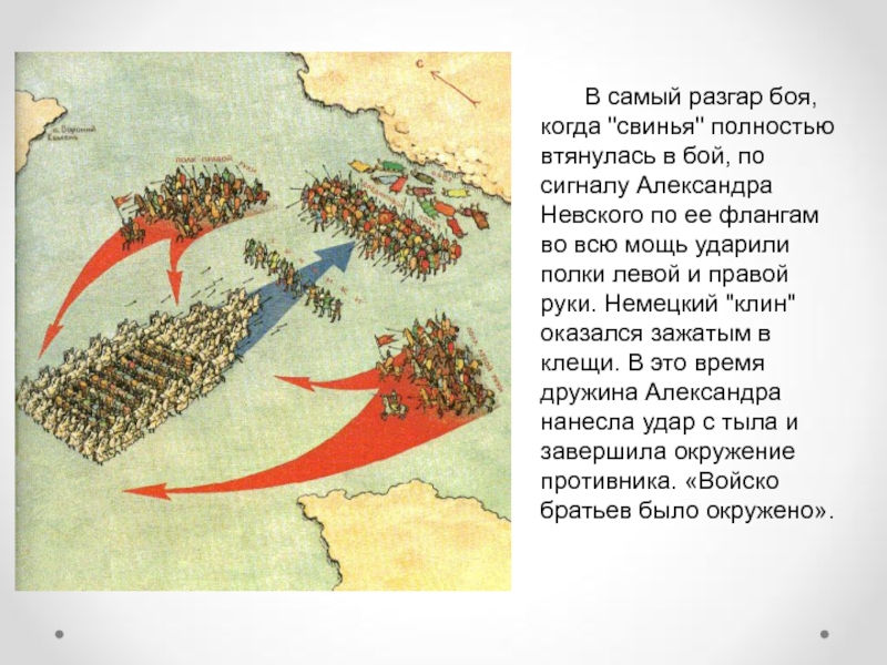ударили полки левой и правой руки. Немецкий "клин" оказался зажатым в клещи. В это время дружина Александра нанесла удар с тыла и завершила окружение противника. «Войско братьев было окружено».