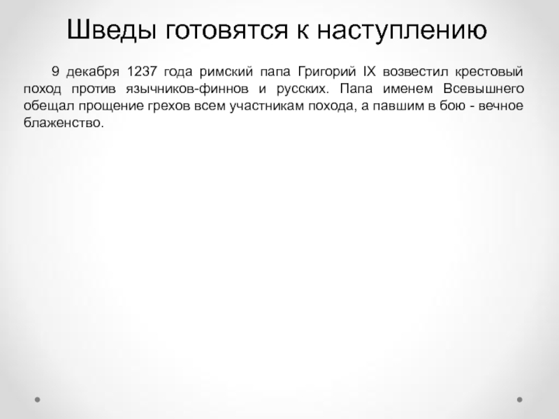 Шведы готовятся к наступлению	9 декабря 1237 года римский папа Григорий IX возвестил крестовый поход против язычников-финнов и