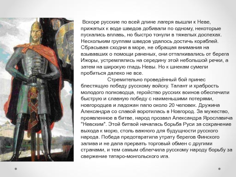 герой этой битвы, князь Александр Ярославич, благодаря этой победе, благодаря последующей дипломатической игре с Ордой, стал очень заметной фигурой нашей истории.