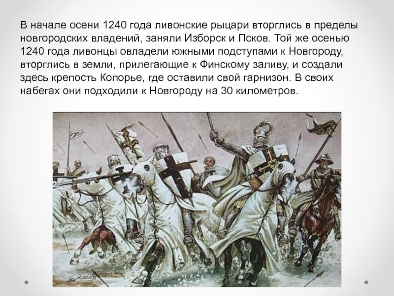 В начале осени 1240 года ливонские рыцари вторглись в пределы новгородских владений, заняли Изборск и Псков. Той