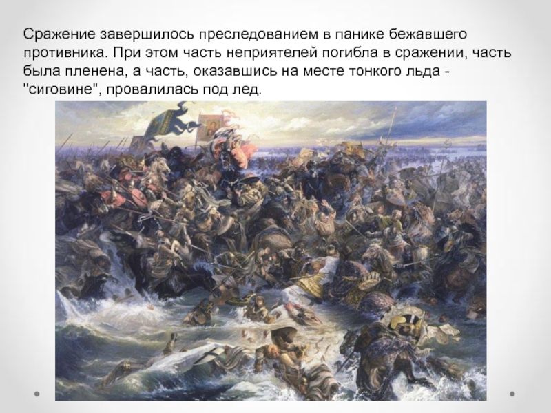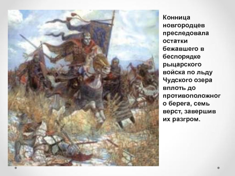 Слайд 24Конница новгородцев преследовала остатки бежавшего в беспорядке рыцарского войска по