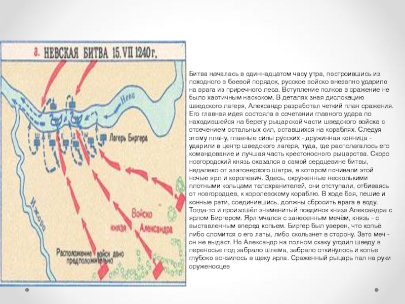 ударило на врага из приречного леса. Вступление полков в сражение не было хаотичным наскоком. В деталях зная дислокацию шведского лагеря, Александр разработал четкий план сражения. Его главная идея состояла в сочетании главного удара по находившейся на берегу рыцарской части шведского войска с отсечением остальных сил, оставшихся на кораблях. Следуя этому плану, главные силы русских - дружинная конница - ударили в центр шведского лагеря, туда, где располагалось его командование и лучшая часть крестоносного рыцарства. Скоро новгородский князь оказался в самой сердцевине битвы, недалеко от златоверхого шатра, в котором почивали этой ночью ярл и королевич. Здесь, окруженные несколькими плотными кольцами телохранителей, они отступали, отбиваясь от новгородцев, к королевскому кораблю. В ходе боя, пешие и конные рати, соединившись, должны сбросить врага в воду. Тогда-то и произошёл знаменитый поединок князя Александра с ярлом Биргером. Ярл мчался с занесенным мечём, князь - с выставленным вперед копьем. Биргер был уверен, что копьё либо сломится о его латы, либо скользнет в сторону. Зато меч - он не выдаст. Но Александр на полном скаку угодил шведу в переносье под забрало шлема, забрало откинулось и копье глубоко вонзилось в щеку ярла. Сраженный рыцарь пал на руки оруженосцев
