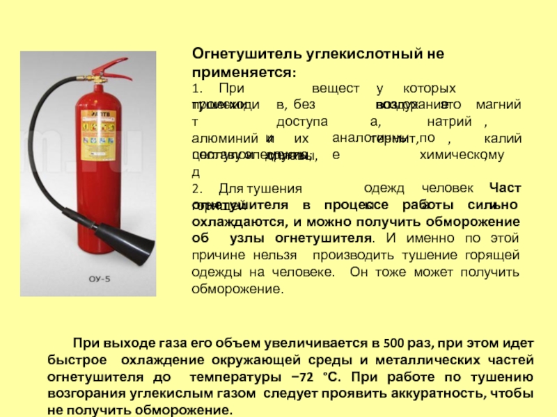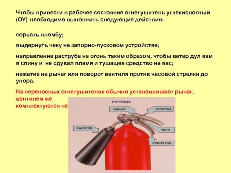 Чтобы привести в рабочее состояние огнетушитель углекислотный (ОУ) необходимо выполнить следующие действия: