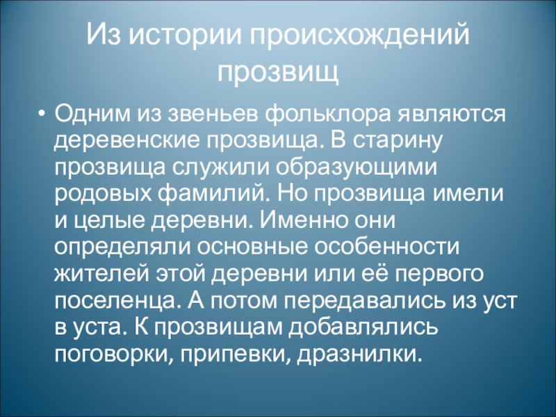 и целые деревни. Именно они определяли основные особенности жителей этой деревни или её первого поселенца. А потом передавались из уст в уста. К прозвищам добавлялись поговорки, припевки, дразнилки.