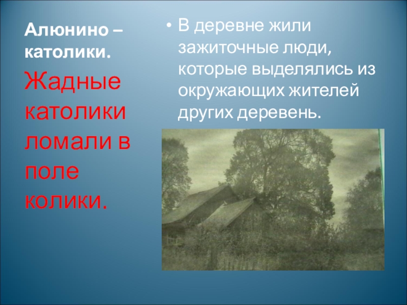 Алюнино – католики.В деревне жили зажиточные люди, которые выделялись из окружающих жителей других деревень.Жадные католики ломали в