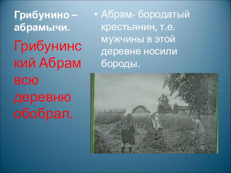 Грибунино – абрамычи.Абрам- бородатый крестьянин, т.е. мужчины в этой деревне носили бороды.Грибунинский Абрам всю деревню обобрал.