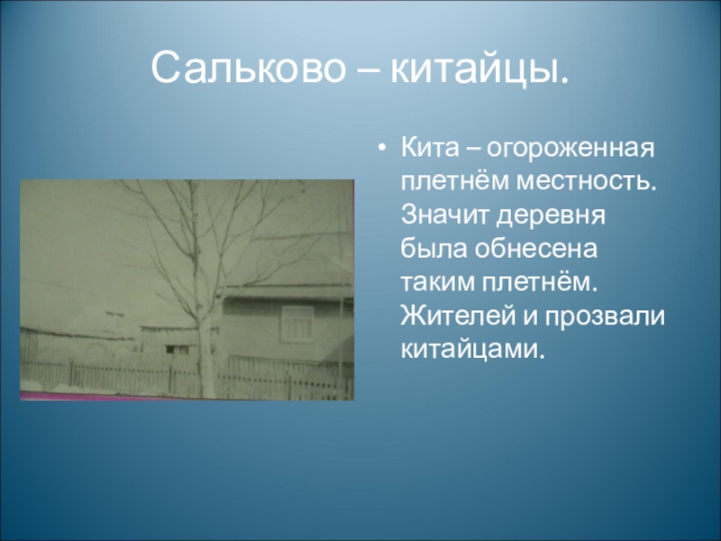 Сальково – китайцы.Кита – огороженная плетнём местность. Значит деревня была обнесена таким плетнём. Жителей и прозвали китайцами.