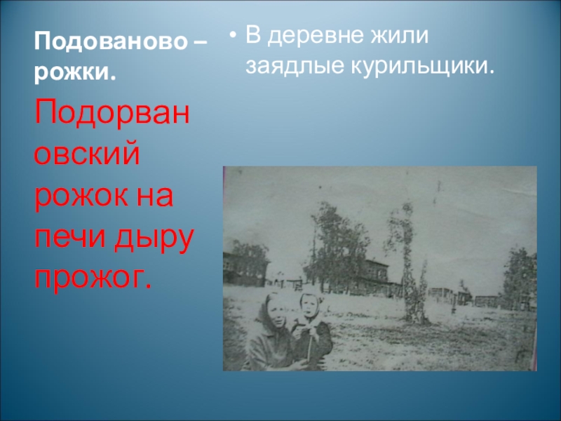Подованово – рожки.В деревне жили заядлые курильщики.Подорвановский рожок на печи дыру прожог.