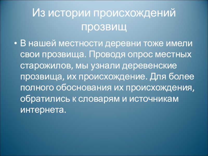 Из истории происхождений прозвищВ нашей местности деревни тоже имели свои прозвища. Проводя опрос местных старожилов, мы узнали