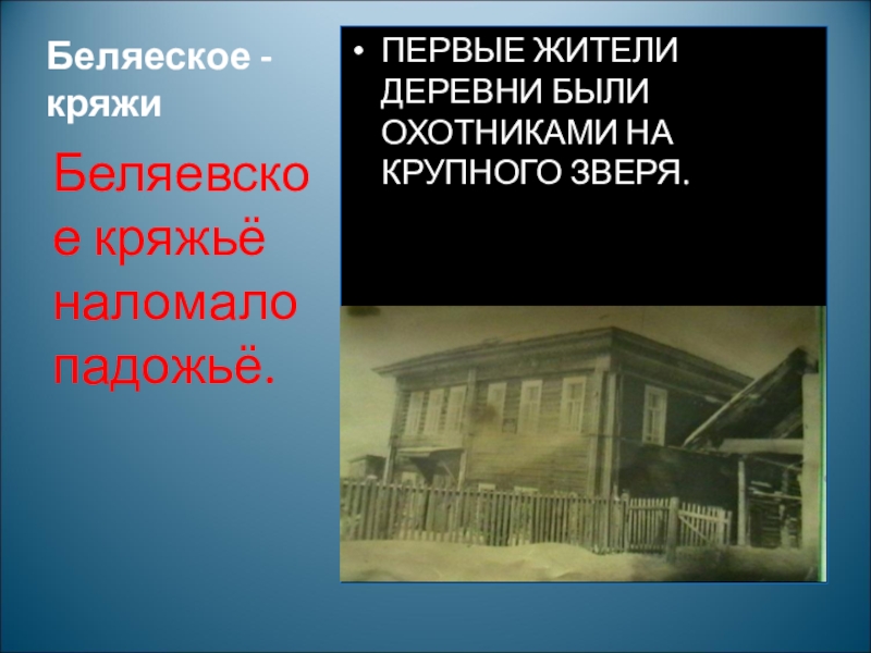 Беляеское -кряжиПЕРВЫЕ ЖИТЕЛИ ДЕРЕВНИ БЫЛИ ОХОТНИКАМИ НА КРУПНОГО ЗВЕРЯ.Беляевское кряжьё наломало падожьё.