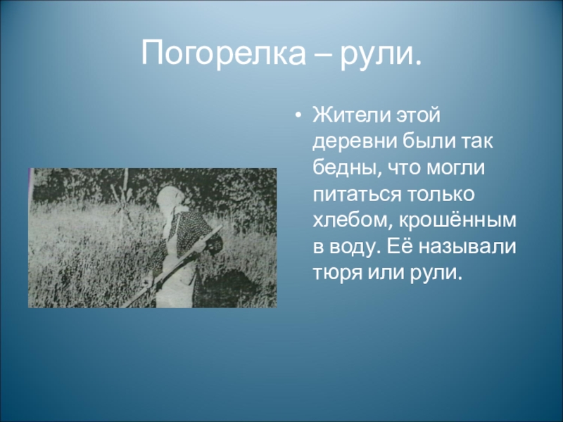 Погорелка – рули.Жители этой деревни были так бедны, что могли питаться только хлебом, крошённым в воду. Её