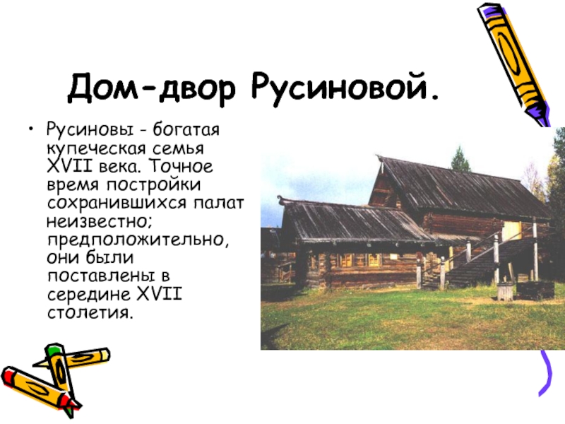 Дом-двор Русиновой. Русиновы - богатая купеческая семья XVII века. Точное время постройки сохранившихся палат неизвестно; предположительно, они