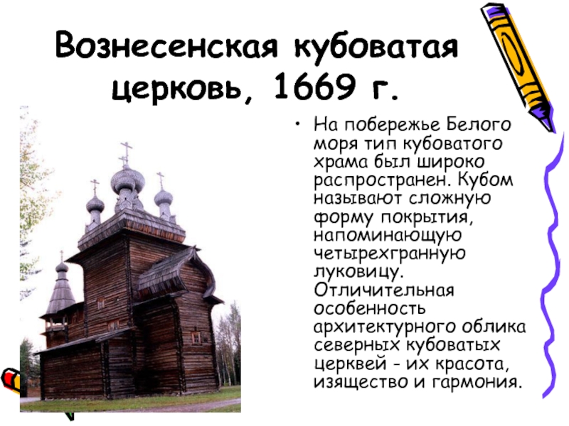 Вознесенская кубоватая церковь, 1669 г. На побережье Белого моря тип кубоватого храма был широко распространен. Кубом называют