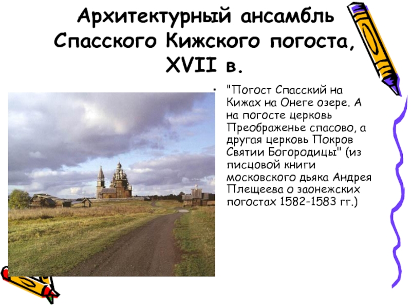 Слайд 9Архитектурный ансамбль Спасского Кижского погоста, XVII в.