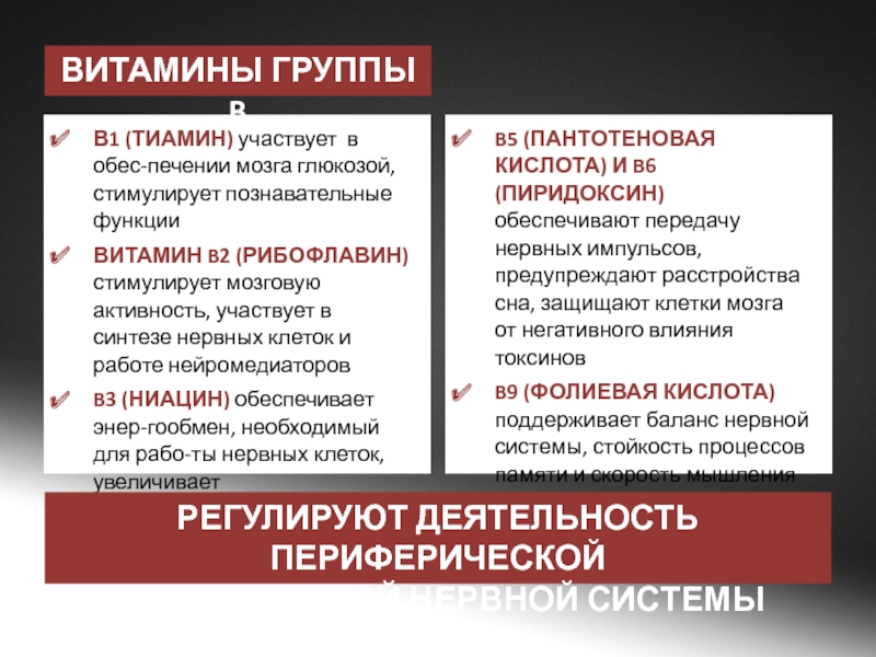 B5 (ПАНТОТЕНОВАЯ КИСЛОТА) И B6 (ПИРИДОКСИН) обеспечивают передачу нервных импульсов, предупреждают расстройства сна, защищают клетки мозга