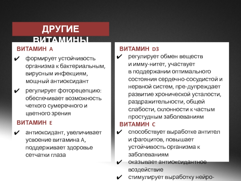 регулирует обмен веществ и имму-нитет, участвует в поддержании оптимального состояния сердечно-сосудистой и нервной систем, пре-дупреждает развитие хронической усталости, раздражительности, общей слабости, склонности к частым простудным заболеваниям