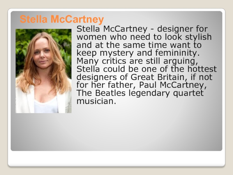 mystery and femininity. Many critics are still arguing, Stella could be one of the hottest designers of Great Britain, if not for her father, Paul McCartney, The Beatles legendary quartet musician.