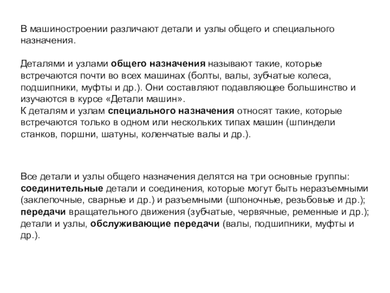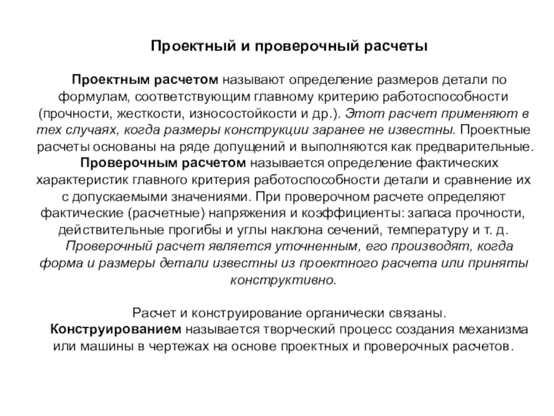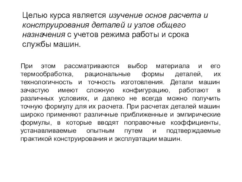 службы машин.При этом рассматриваются выбор материала и его термообработка, рациональные формы деталей, их технологичность и точность изготовления. Детали машин зачастую имеют сложную конфигурацию, работают в различных условиях, и далеко не всегда можно получить точную формулу для их расчета. При расчетах деталей машин широко применяют различные приближенные и эмпирические формулы, в которые вводят поправочные коэффициенты, устанавливаемые опытным путем и подтверждаемые практикой конструирования и эксплуатации машин.