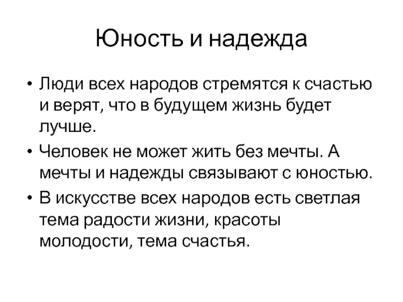 мечты. А мечты и надежды связывают с юностью.В искусстве всех народов есть светлая тема радости жизни, красоты молодости, тема счастья.