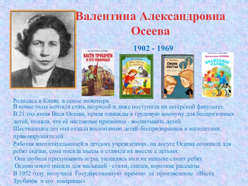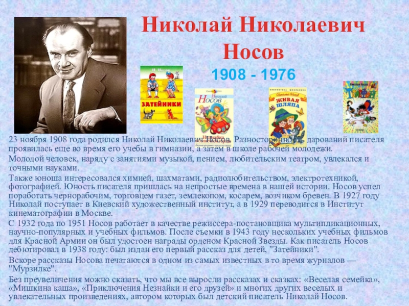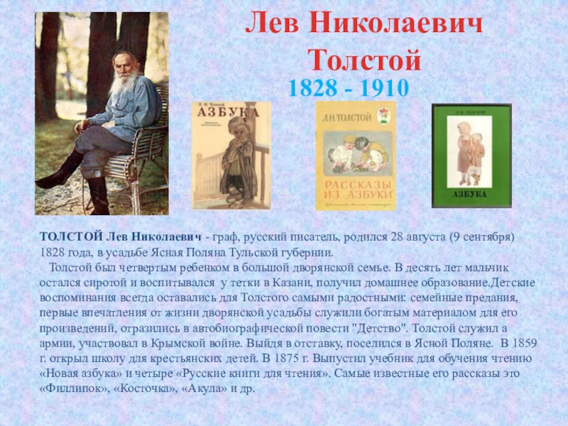 Тульской губернии. Толстой был четвертым ребенком в большой дворянской семье. В десять лет мальчик остался сиротой и воспитывался у тетки в Казани, получил домашнее образование.Детские воспоминания всегда оставались для Толстого самыми радостными: семейные предания, первые впечатления от жизни дворянской усадьбы служили богатым материалом для его произведений, отразились в автобиографической повести "Детство". Толстой служил а армии, участвовал в Крымской войне. Выйдя в отставку, поселился в Ясной Поляне. В 1859 г. открыл школу для крестьянских детей. В 1875 г. Выпустил учебник для обучения чтению «Новая азбука» и четыре «Русские книги для чтения». Самые известные его рассказы это «Филлипок», «Косточка», «Акула» и др.1828 - 1910