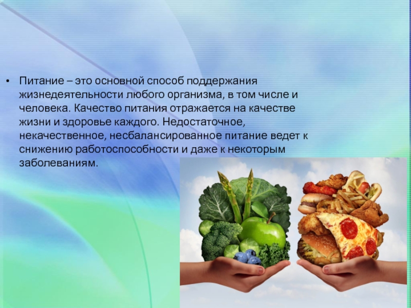 Слайд 2Питание – это основной способ поддержания жизнедеятельности любого организма, в
