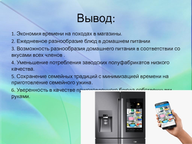 Вывод:1. Экономия времени на походах в магазины. 2. Ежедневное разнообразие блюд в домашнем питании3. Возможность разнообразия домашнего