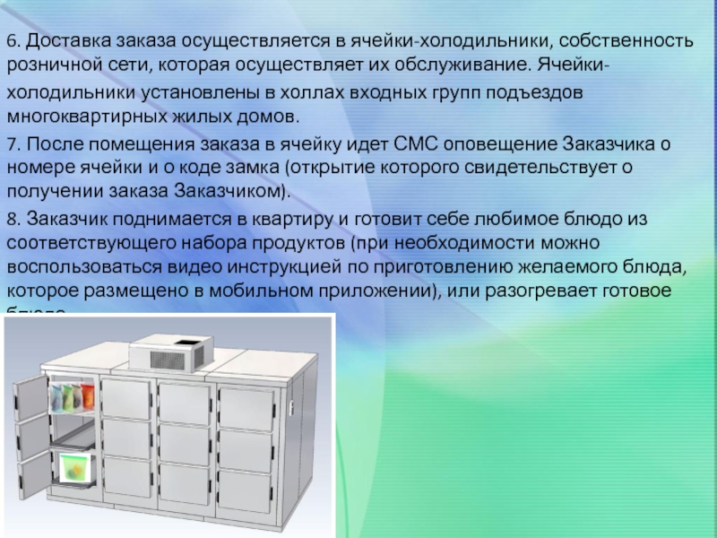 6. Доставка заказа осуществляется в ячейки-холодильники, собственность розничной сети, которая осуществляет их обслуживание. Ячейки-холодильники установлены в холлах
