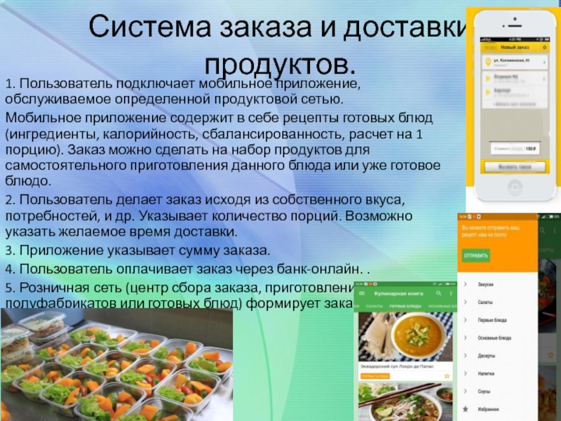 Система заказа и доставки продуктов. 1. Пользователь подключает мобильное приложение, обслуживаемое определенной продуктовой сетью. Мобильное приложение содержит