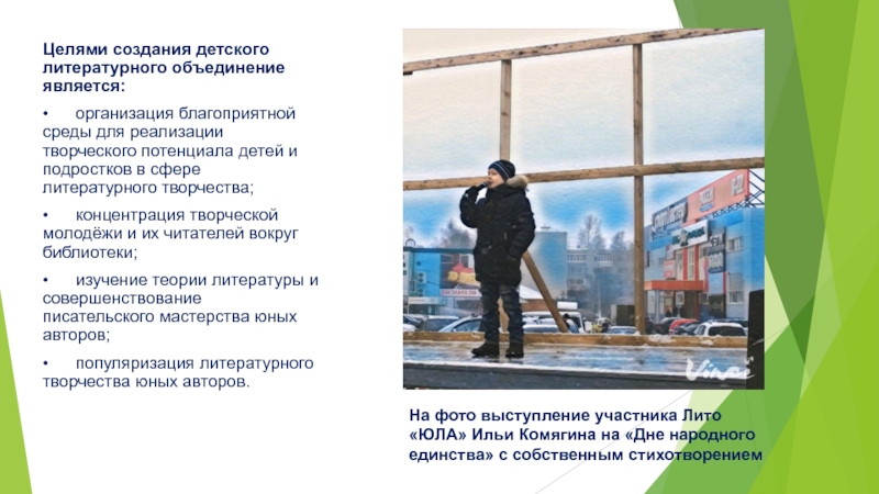 На фото выступление участника Лито «ЮЛА» Ильи Комягина на «Дне народного единства» с собственным стихотворением