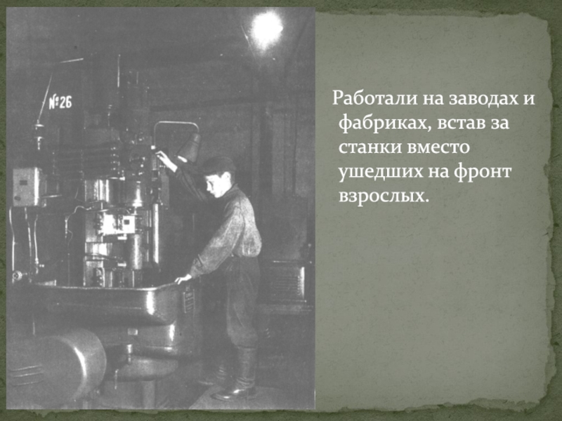 Слайд 9 Работали на заводах и фабриках, встав за станки вместо