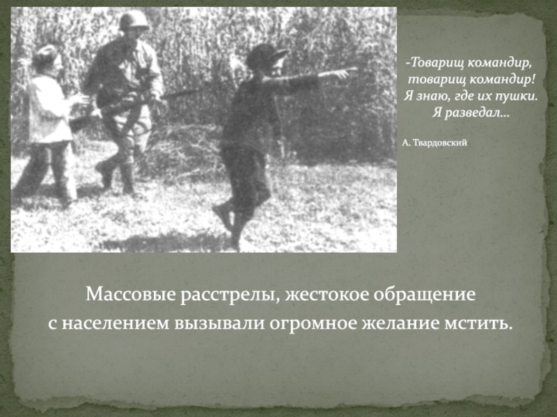 Массовые расстрелы, жестокое обращение с населением вызывали огромное желание мстить.Товарищ командир, товарищ командир!Я знаю, где их пушки.