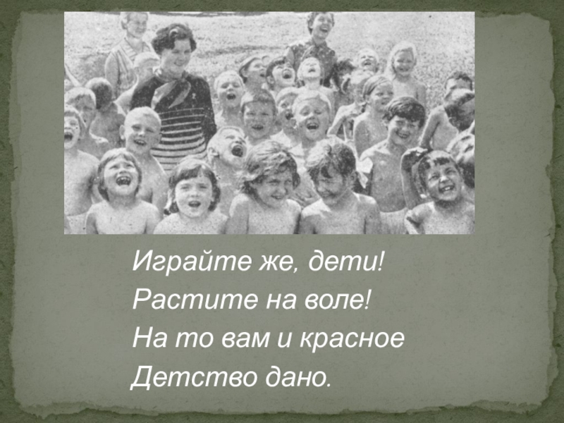 Играйте же, дети!Растите на воле!На то вам и красноеДетство дано.