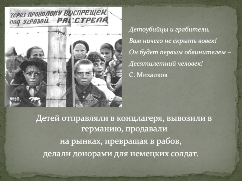 Слайд 18 Детей отправляли в концлагеря, вывозили в германию, продавали
