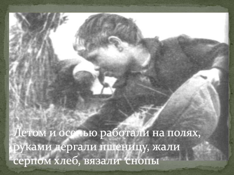 Слайд 11Летом и осенью работали на полях, руками дергали пшеницу, жали
