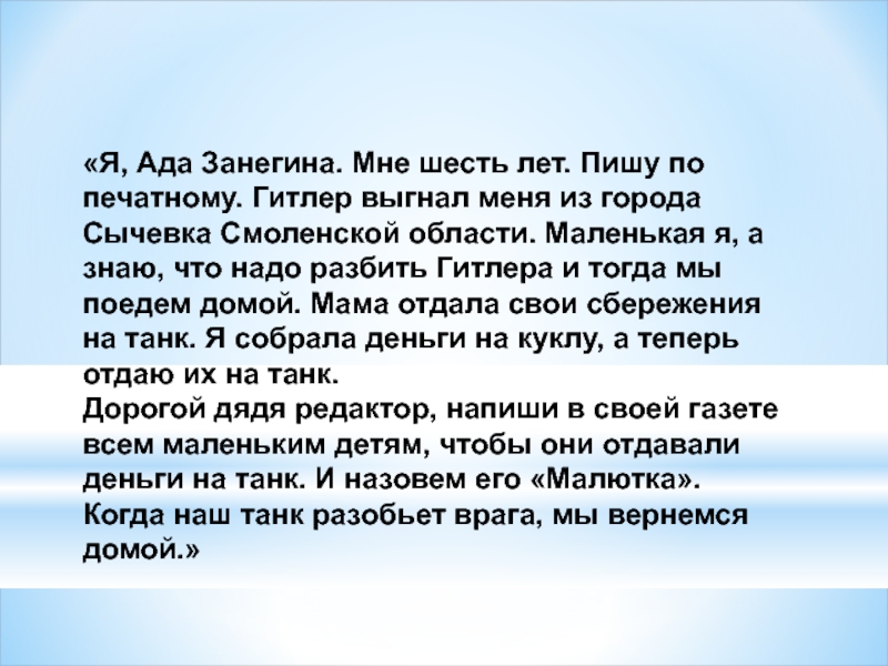 знаю, что надо разбить Гитлера и тогда мы поедем домой. Мама отдала свои сбережения на танк. Я собрала деньги на куклу, а теперь отдаю их на танк. Дорогой дядя редактор, напиши в своей газете всем маленьким детям, чтобы они отдавали деньги на танк. И назовем его «Малютка». Когда наш танк разобьет врага, мы вернемся домой.»
