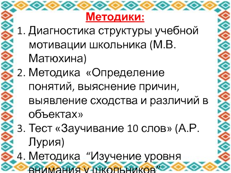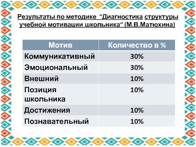 Слайд 11Результаты по методике “Диагностика структуры учебной мотивации школьника” (М.В.Матюхина)