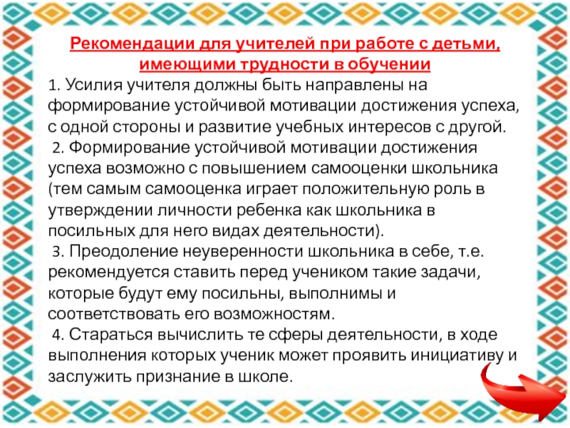 Слайд 15Рекомендации для учителей при работе с детьми, имеющими трудности в