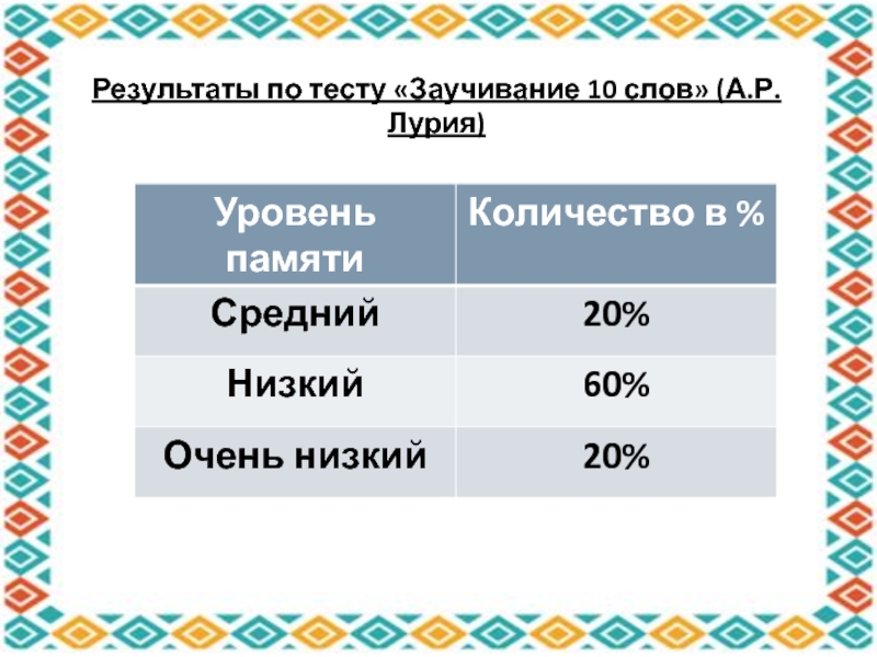 Слайд 13Результаты по тесту «Заучивание 10 слов» (А.Р.Лурия)