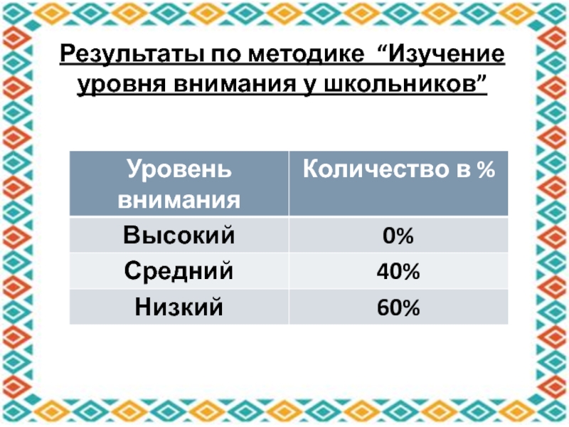 Слайд 14Результаты по методике “Изучение уровня внимания у школьников”
