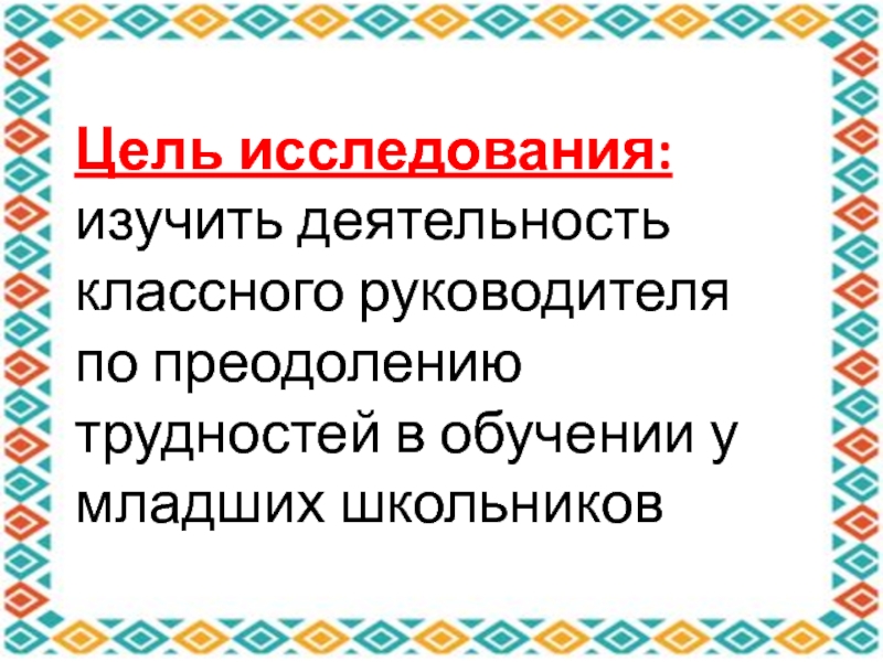 Слайд 3Цель исследования: изучить деятельность классного руководителя по преодолению трудностей в