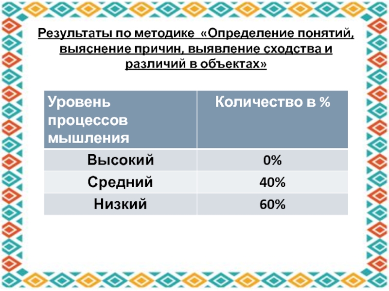 Слайд 12Результаты по методике «Определение понятий, выяснение причин, выявление сходства и