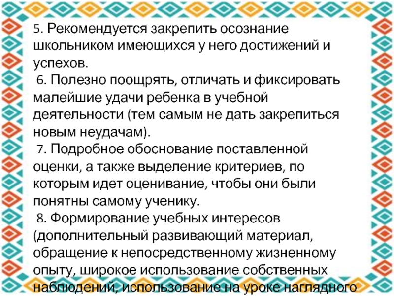 Слайд 165. Рекомендуется закрепить осознание школьником имеющихся у него достижений и
